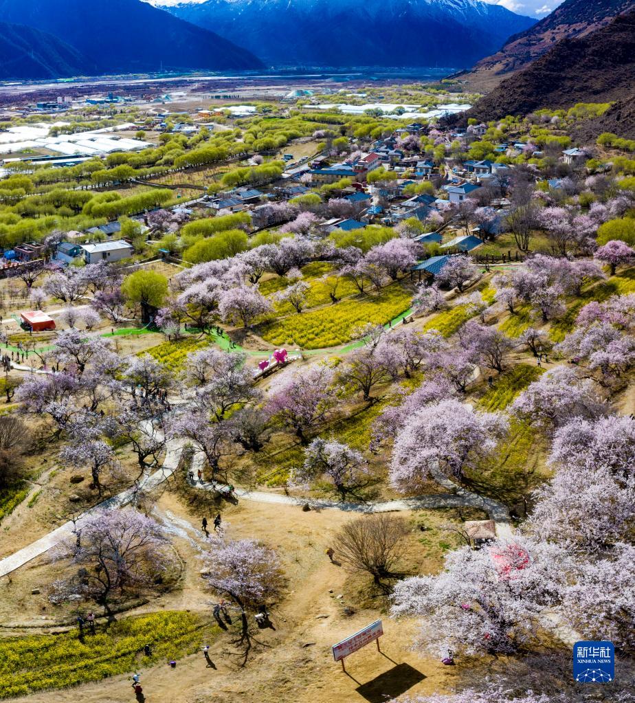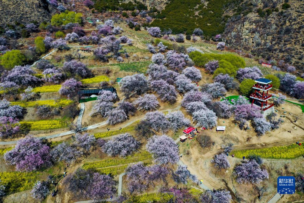 鳥瞰嘎拉村桃花園(無人機照片,3月24日攝)。新華社記者 姜帆 攝