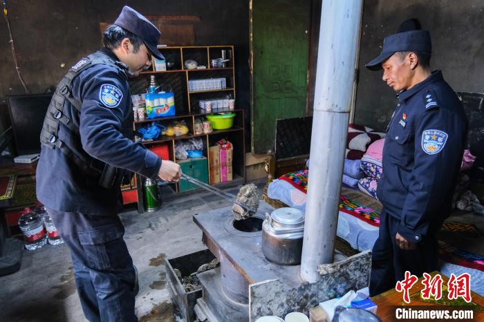 圖為西藏山南移民管理警察向軍(左)在公漳浦執(zhí)勤點為火爐添加風(fēng)干牦牛糞?!〗w波 攝