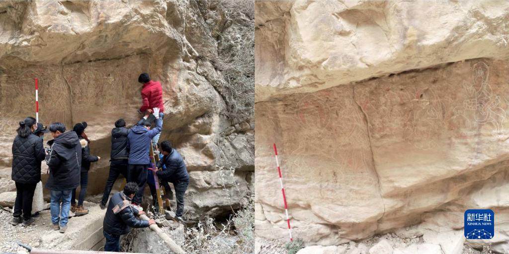 (左)工作人員正在對查果西溝B點摩崖石刻造像進行調(diào)查記錄,(右)該摩崖石刻造像現(xiàn)狀。(資料圖片由西藏自治區(qū)文物保護研究所提供)