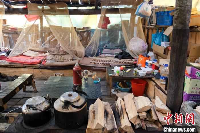 德瑪龍6號執(zhí)勤點木板房是大家在森林里的庇護所,進入后可以看到房內(nèi)左右兩側(cè)布置了兩排通鋪,每人的床位由一個罩式蚊帳以及被褥組成,屋子中間有個藏式爐子,里面燒著并不干燥的木柴。