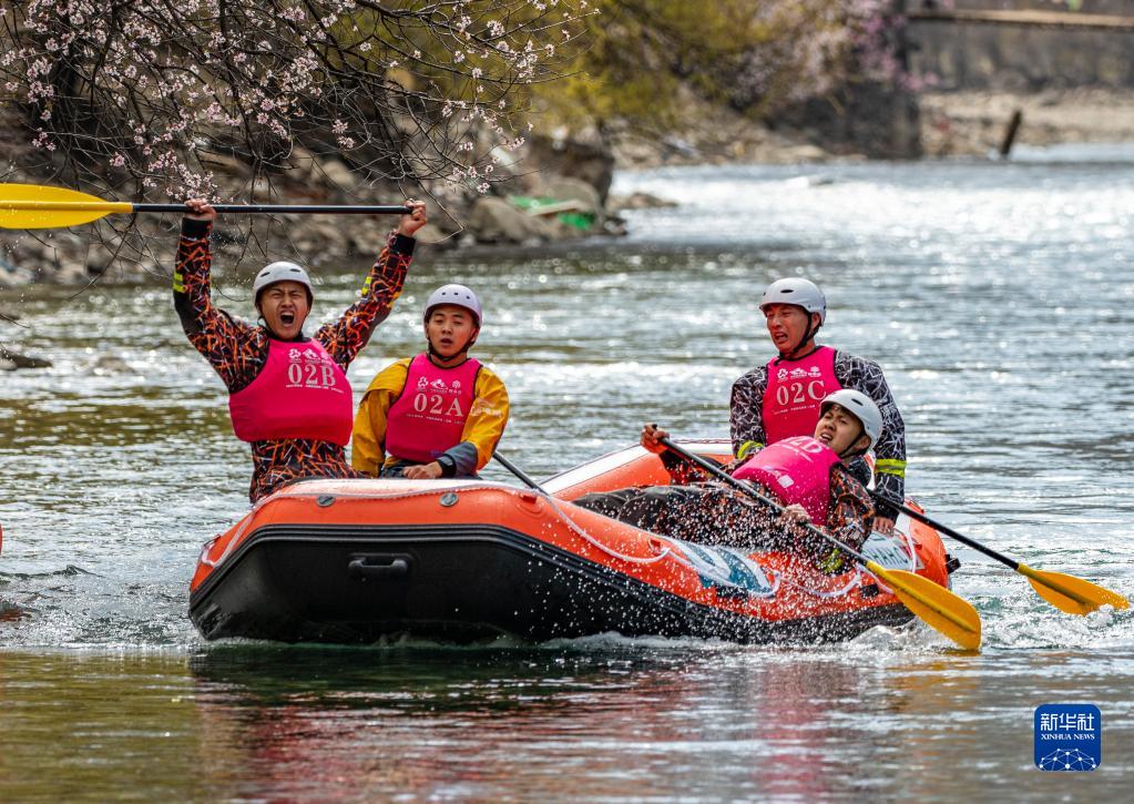 4月16日,西藏旅游股份有限公司漂流隊(duì)(前)在激流漂流筏追逐賽中。最終,他們獲得亞軍。新華社記者 孫非 攝