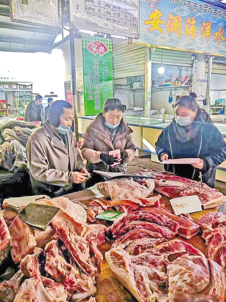 圖為拉薩市有關(guān)工作人員深入市場,查看糧油菜肉蛋奶等商品價格、供應(yīng)情況。