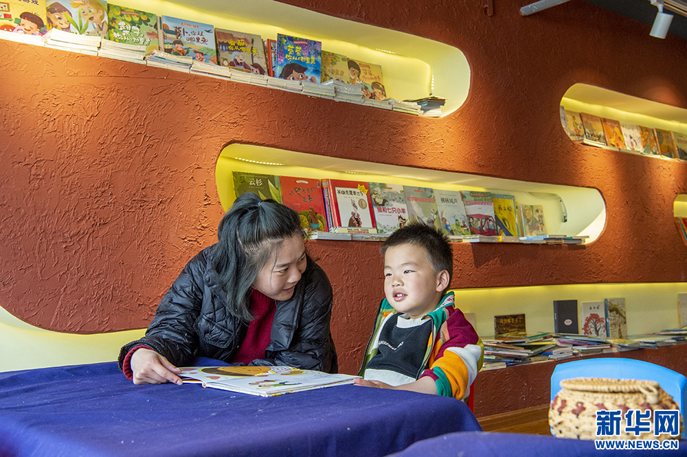 4月23日,一對(duì)母子在書店里閱讀繪本。新華網(wǎng) 旦增努布 攝