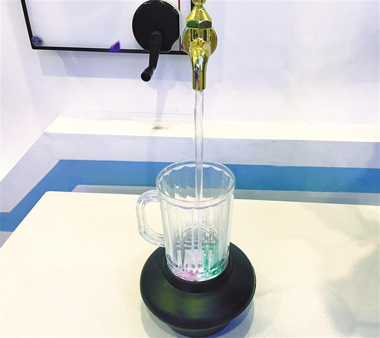 在科技體驗(yàn)區(qū),一個(gè)巨大的水龍頭吸引了所有人的目光,這個(gè)水龍頭在沒(méi)有支撐的情況下竟然漂浮在空中,一股不知從哪里來(lái)的水源源不斷地從水龍頭中流出。在索央的引導(dǎo)下,小朋友輪流去觸摸水流,發(fā)現(xiàn)支撐水龍頭的是一根透明的水管,被流下的水流遮擋,水管把水輸送到水龍頭,再讓水從外面流下,看起來(lái)就好像一股從天而降的水柱。