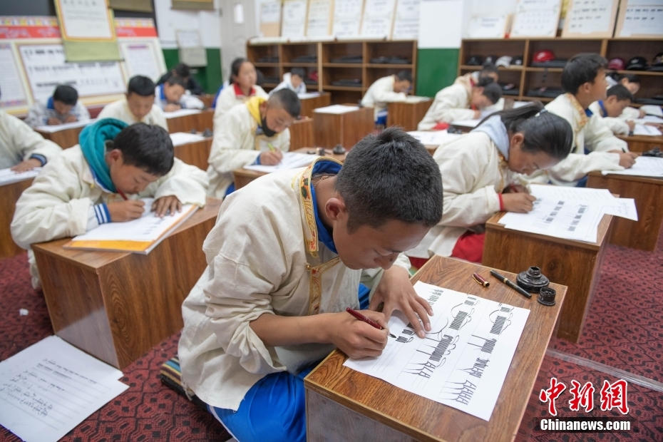 5月7日,西藏山南市,加查縣中學(xué)學(xué)生在上藏文書法興趣班。該興趣班由2名藏文教師任教,每周兩課時,利用自習(xí)課或晚自習(xí)時間為學(xué)生和教師授課。課程內(nèi)容包含執(zhí)筆、運(yùn)筆、姿勢等基礎(chǔ)書寫技能,以及藏文中的烏金體、珠擦體、簇仁體、簇通體等各類字體的書寫方法。