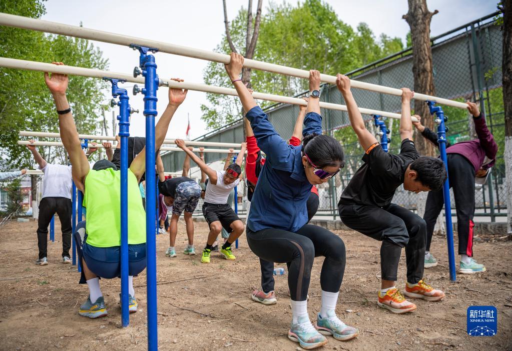 在西藏拉薩市當(dāng)雄縣羊八井鎮(zhèn),玉珍拉姆(中)在訓(xùn)練休息時(shí)和隊(duì)友聊天(5月2日攝)。新華社記者 孫非 攝