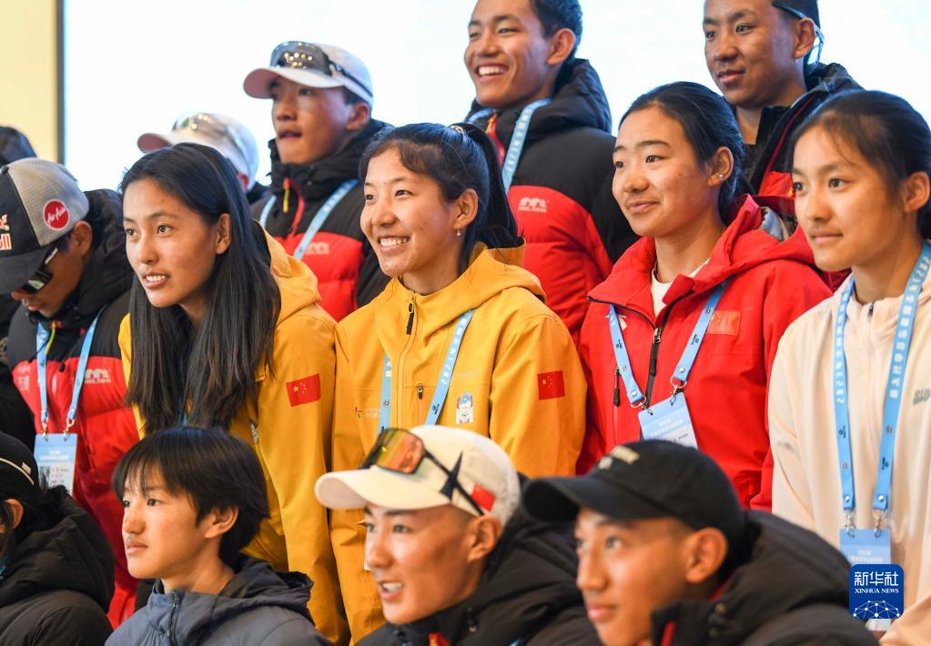 在新疆富蘊(yùn)縣,玉珍拉姆(中排右三)和參與全國(guó)首屆滑雪登山冠軍賽的西藏代表隊(duì)隊(duì)友合影留念(4月7日攝)。新華社記者 胡虎虎 攝