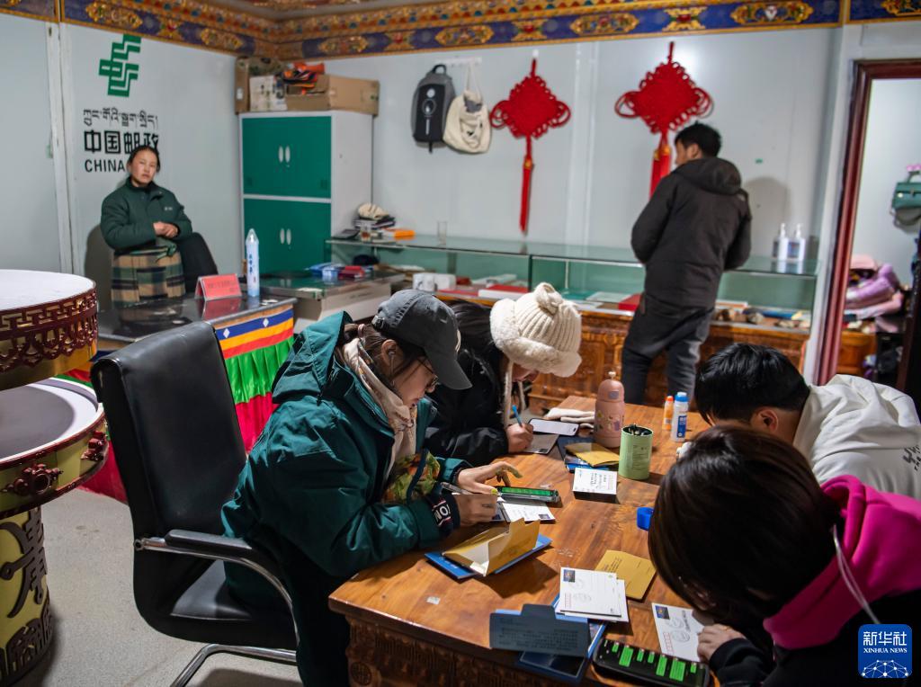 在珠峰游客大本營(yíng)的郵政所,游客在寫(xiě)明信片(5月13日攝)。新華社記者 孫非 攝