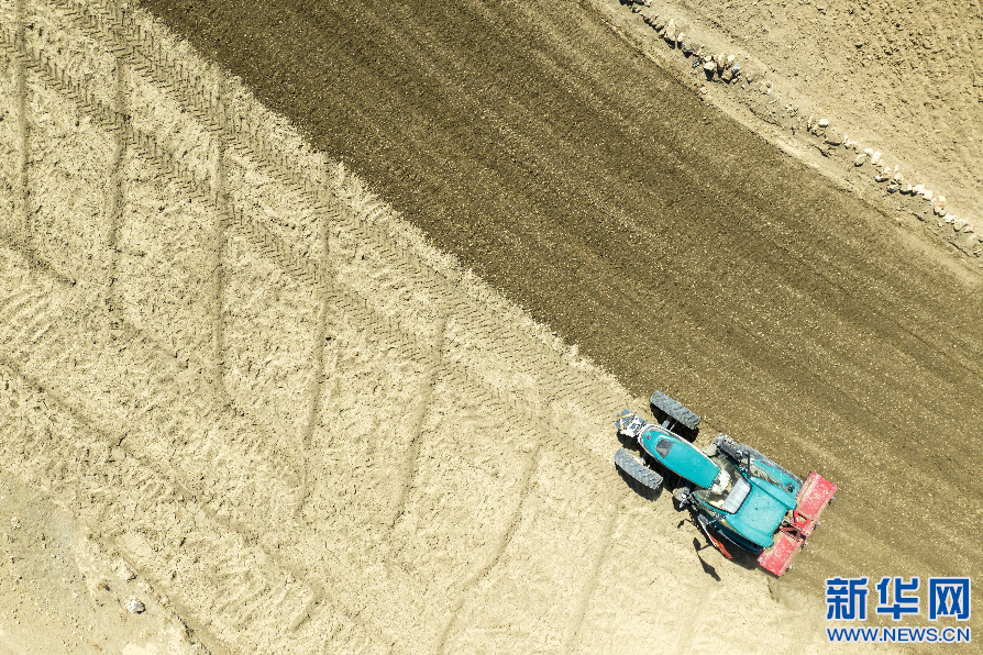 5月12日,西藏定日縣扎西宗鄉(xiāng)巴松村的村民在犁地(無人機照片)。 新華網(wǎng) 旦增努布 攝