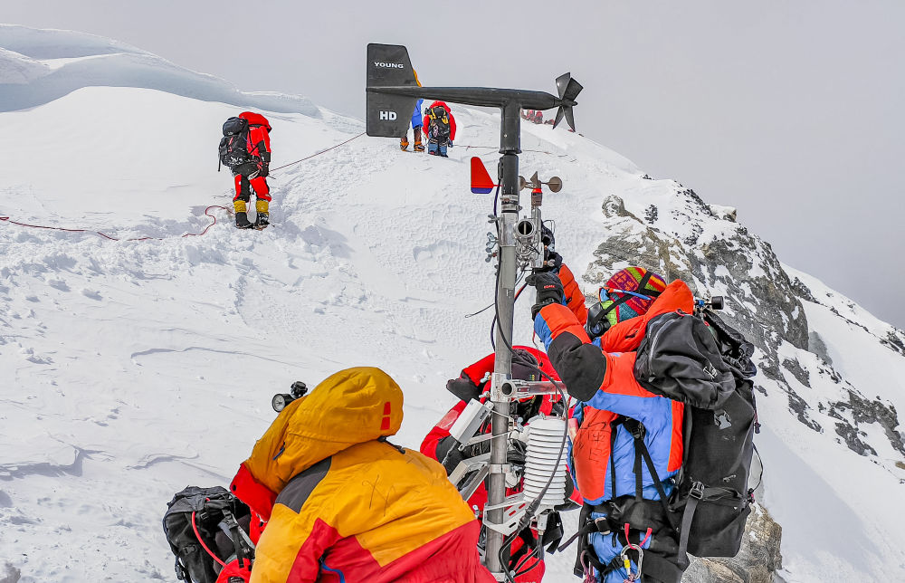 當(dāng)日凌晨3時(shí),科考隊(duì)員從海拔8300米的突擊營地出發(fā),歷經(jīng)數(shù)小時(shí)攀登,終于抵達(dá)海拔8830米的世界最高自動(dòng)氣象觀測站。固定鋼筋繩索,更換蓄電池,安裝風(fēng)速風(fēng)向傳感器……經(jīng)過約1小時(shí)的緊張工作,氣象站零部件升級工作全部完成。隨后,他們攀登至8848.86米的峰頂,利用工具成功采集雪冰樣品。