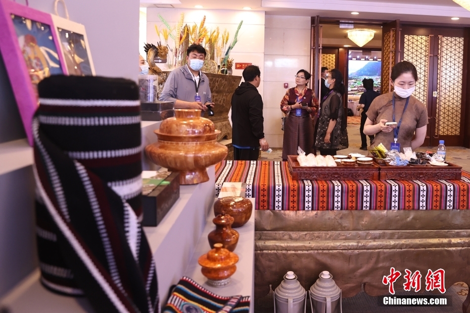 5月23日,“2023·中國(guó)西藏發(fā)展論壇”在北京舉行。會(huì)場(chǎng)外,活潑獨(dú)特的藏式迎賓舞蹈、展示西藏人文自然風(fēng)貌的圖片,已在論壇開(kāi)幕前預(yù)熱起探討西藏新發(fā)展的氛圍。圖為展臺(tái)上,布置著色彩豐富的藏式布匹、紙藝文創(chuàng)產(chǎn)品、藏香、酥油茶等。