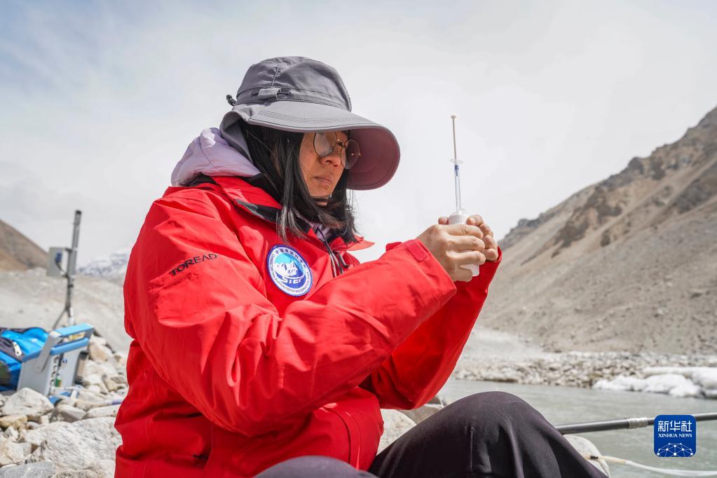 在珠峰登山大本營(yíng)附近,來(lái)自中國(guó)科學(xué)院青藏高原研究所的科考隊(duì)員邱海英在檢測(cè)絨布冰川末端水質(zhì)(5月14日攝)。新華社記者 孫非 攝