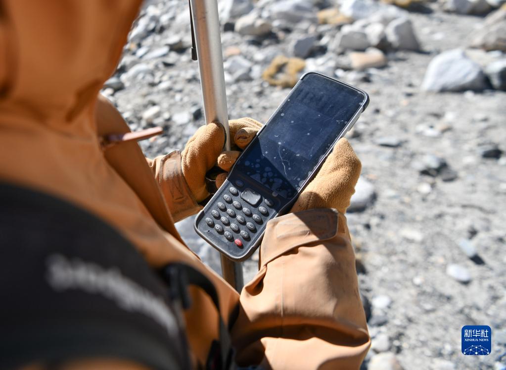 在珠峰海拔約5300米處,來(lái)自中國(guó)科學(xué)院西北生態(tài)環(huán)境資源研究院的科考隊(duì)員薛雨昂在對(duì)冰川進(jìn)行實(shí)時(shí)差分GPS定位(5月15日攝)。新華社記者 晉美多吉 攝