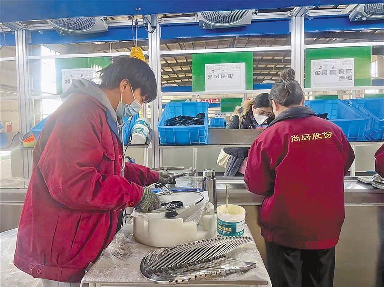 這是西藏尚廚炊具科技有限公司員工正在組裝高原型壓力鍋鍋蓋。 李梅英 攝
