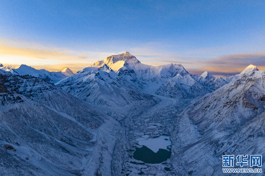 日出時分拍攝的珠穆朗瑪峰(無人機(jī)照片)。 新華網(wǎng) 旦增努布 攝