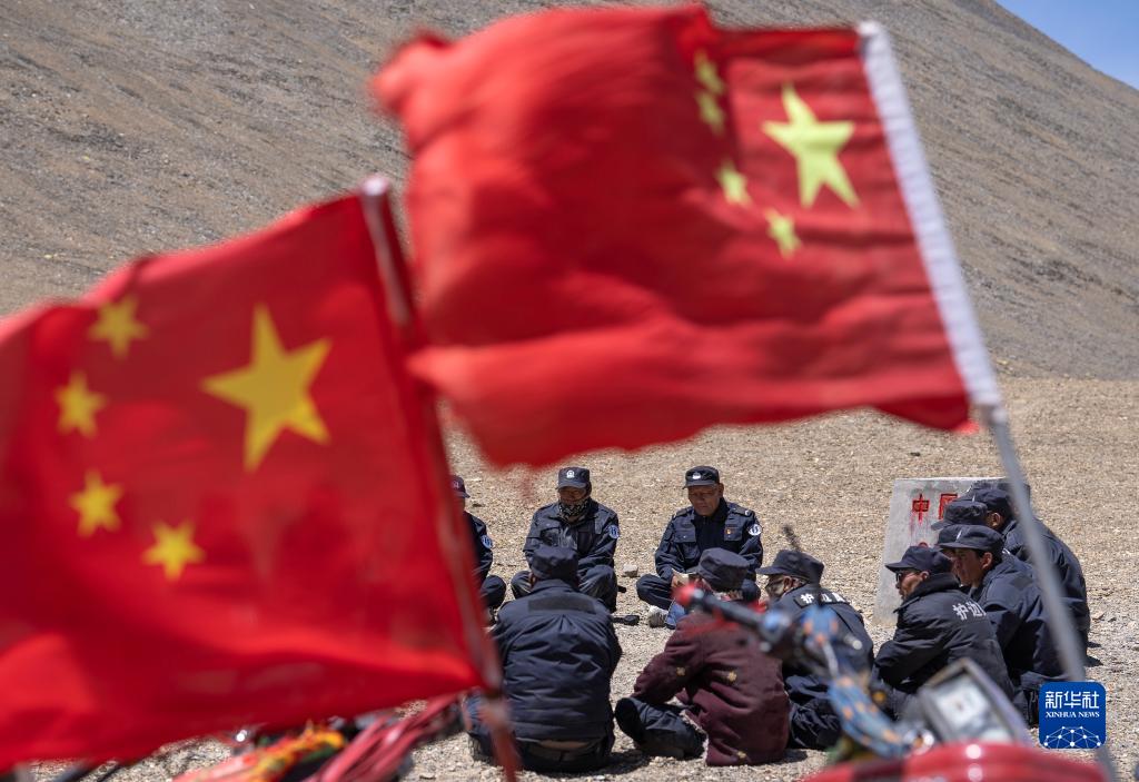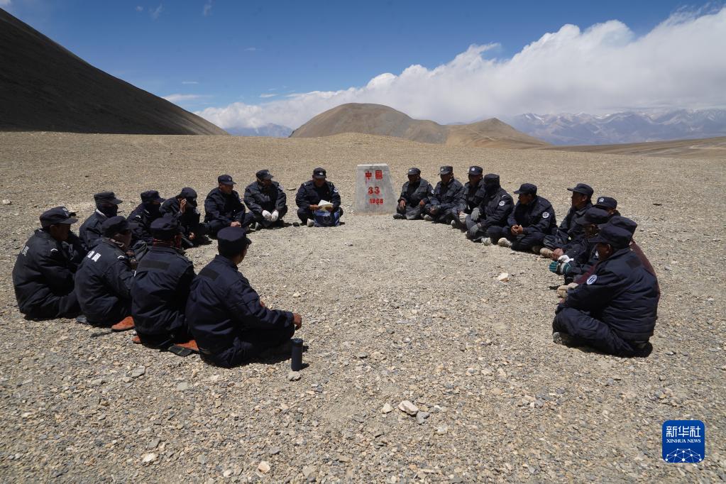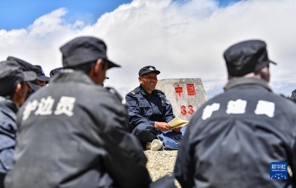 6月2日,在33號界樁處,護邊聯(lián)防隊在隊長石角(右二)的帶領(lǐng)下學(xué)習(xí)。新華社記者 晉美多吉 攝