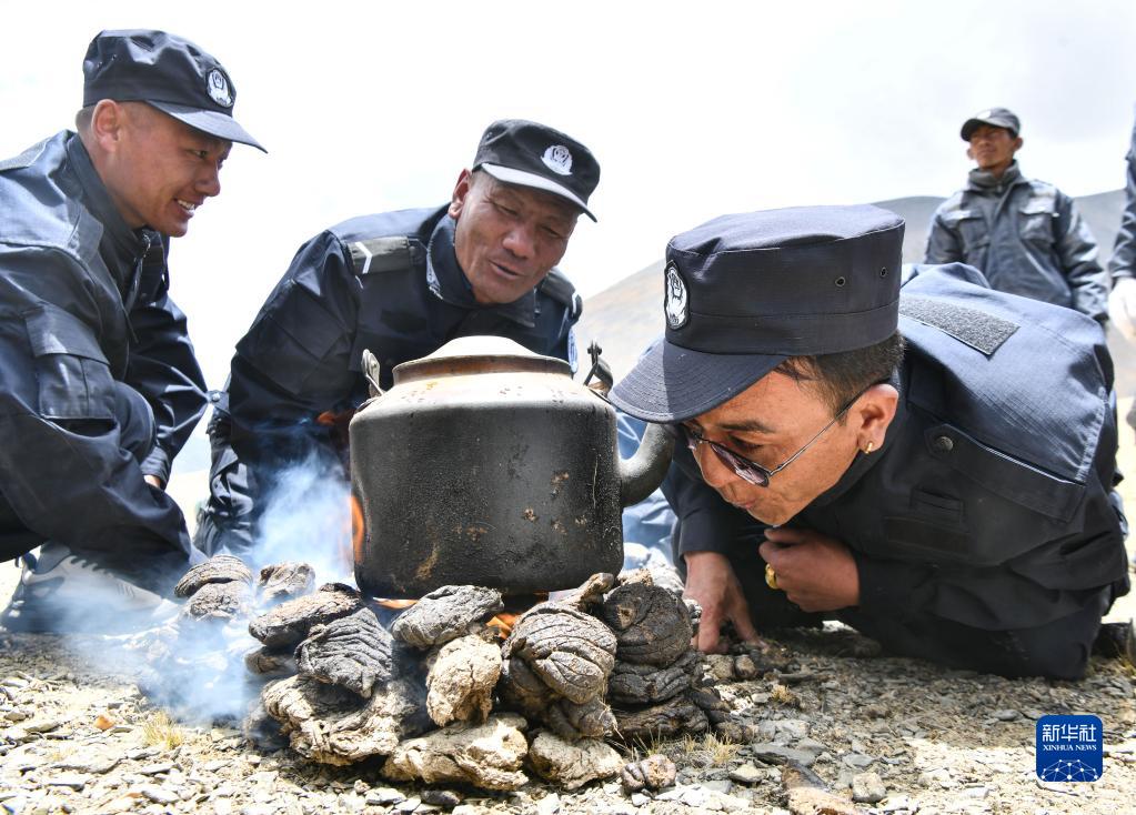 護邊聯(lián)防隊隊員在一塊空地上點燃牛糞,準備午餐(6月2日攝)。新華社記者 晉美多吉 攝