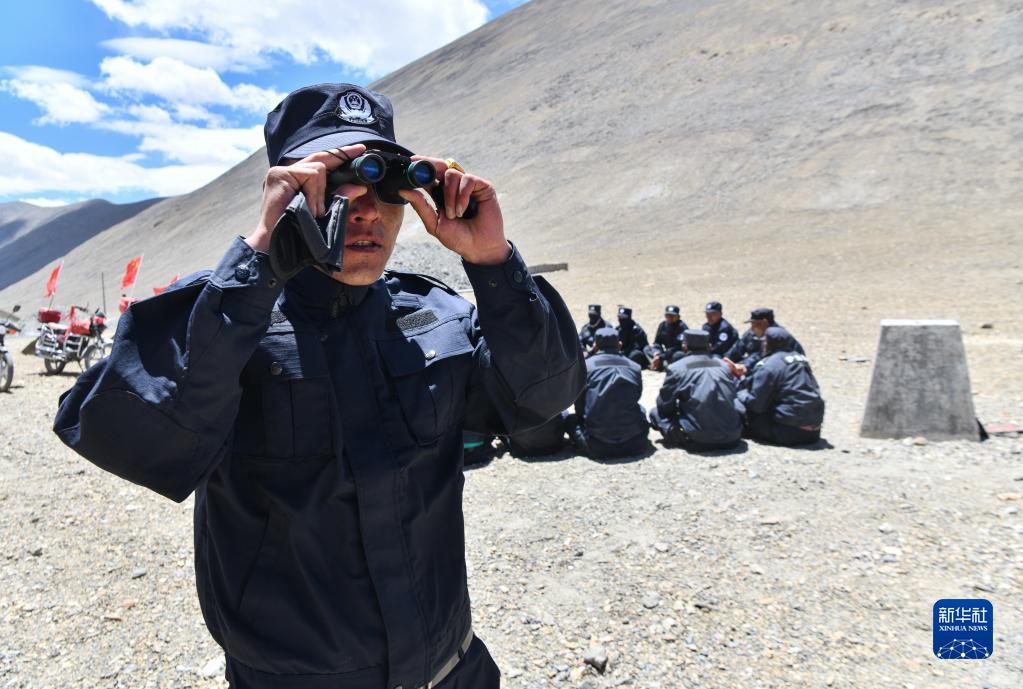 6月2日,在33號界樁處,一名護邊聯(lián)防隊隊員使用望遠鏡巡查。新華社記者 晉美多吉 攝