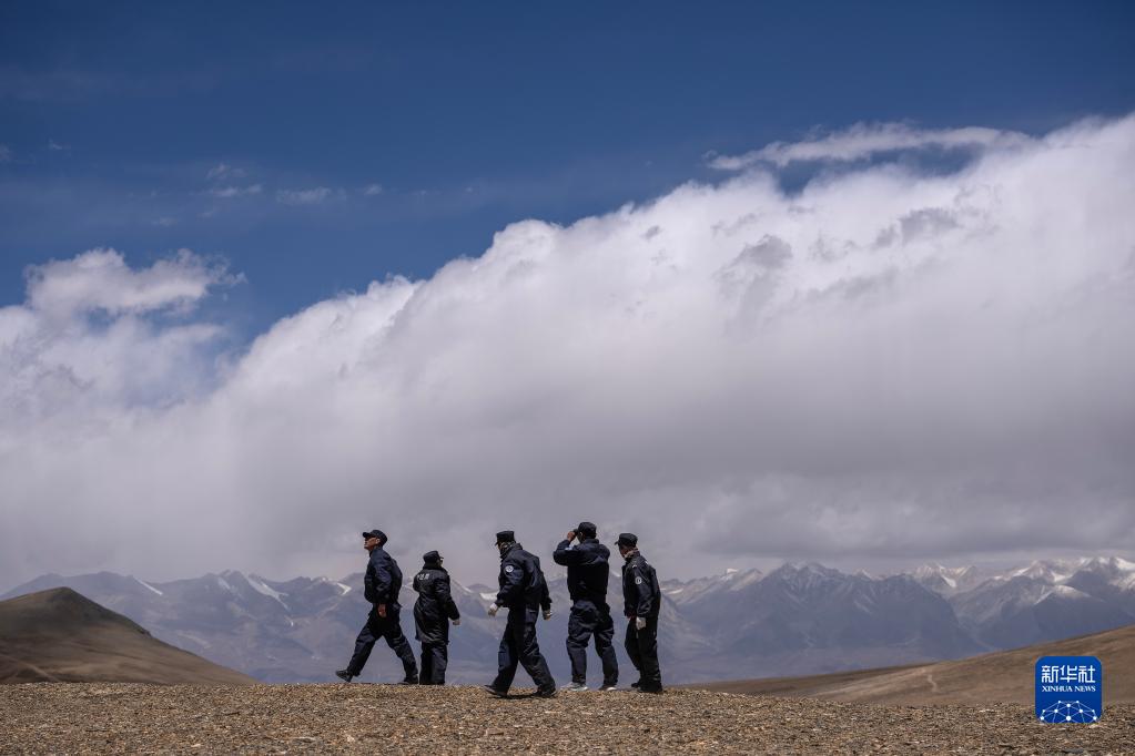 6月2日,石角(上右)在33號界樁處給護邊聯(lián)防隊隊員交代巡邏注意事項。新華社記者 費茂華 攝