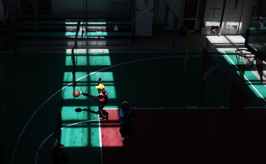 6月5日,扎西宗鄉(xiāng)完全小學的學生在室內體育館上籃球課。