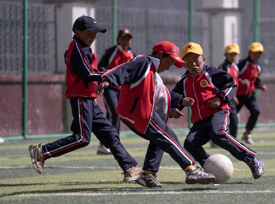 扎西宗鄉(xiāng)完全小學的學生在體育課上踢足球(6月5日攝,無人機照片)。
