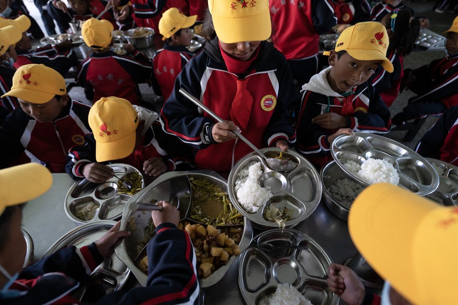 6月5日,扎西宗鄉(xiāng)完全小學的學生在食堂吃午飯,值日生負責給大家打飯菜。