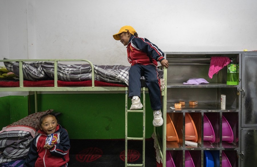 6月5日,扎西宗鄉(xiāng)完全小學的學生在宿舍準備就寢。