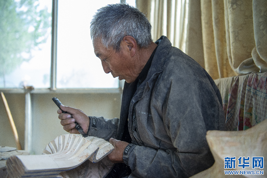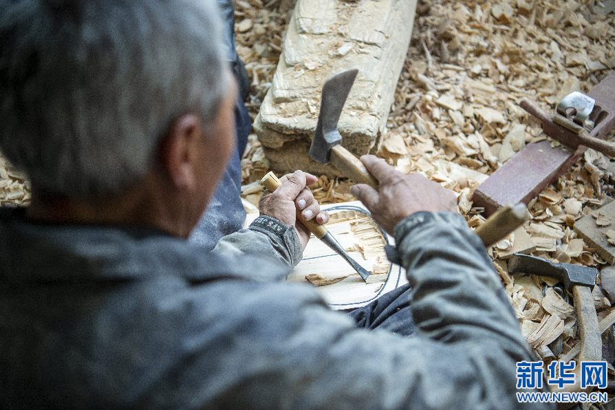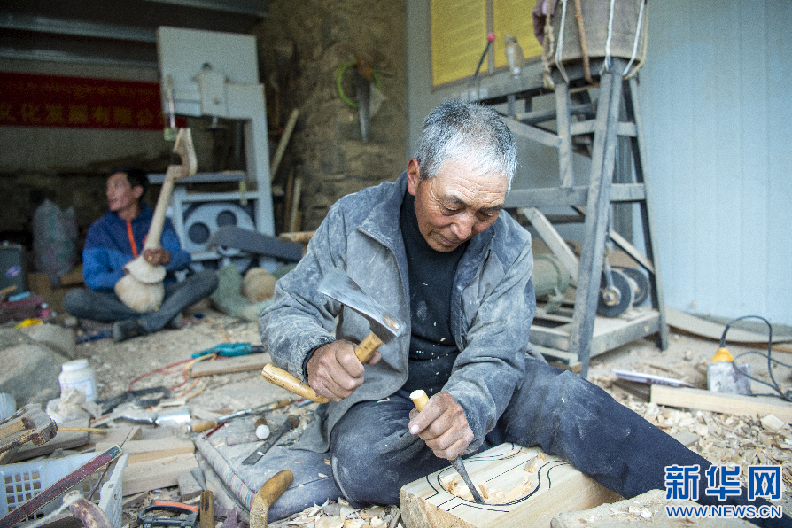 6月8日,娘嘎扎念琴制作技藝傳承人羅布次旦的兒子在制作扎念琴。新華網(wǎng) 旦增努布 攝
