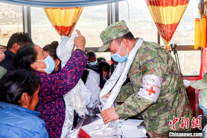 圖為村民紛紛為醫(yī)療隊(duì)軍醫(yī)敬獻(xiàn)哈達(dá)。 朱文秀 攝