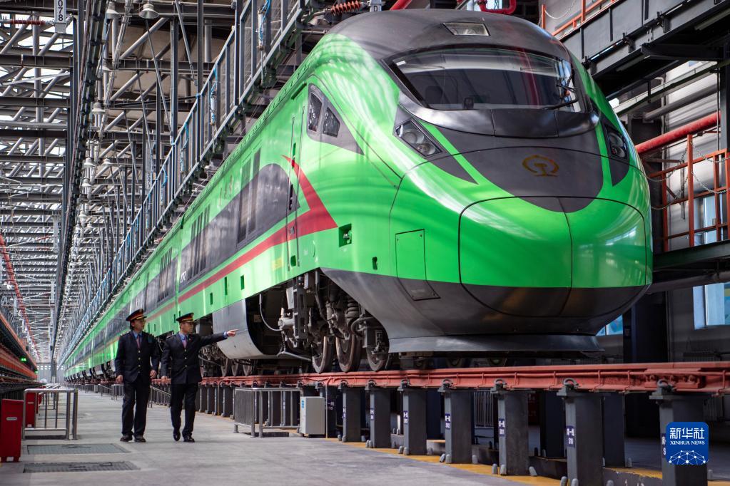 在拉薩機(jī)輛整備中心,“復(fù)興號(hào)”動(dòng)車組在檢修庫(kù)進(jìn)行整備作業(yè)(1月11日攝)。新華社記者 孫非 攝