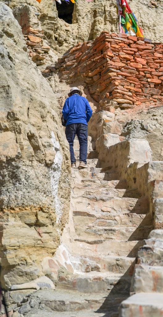 仁增旺扎老人的腿腳不便,每次從山腳登上石窟所在的山頂都需要耗費(fèi)巨大的氣力。皮央和東嘎石窟遺址群所在的小山相對高差大概有150米左右,一共有400多級臺階,每一級臺階都非常陡峭,走路一搖一晃的仁增旺扎老人每次都要花半個小時多才能從山腳登上山頂。
