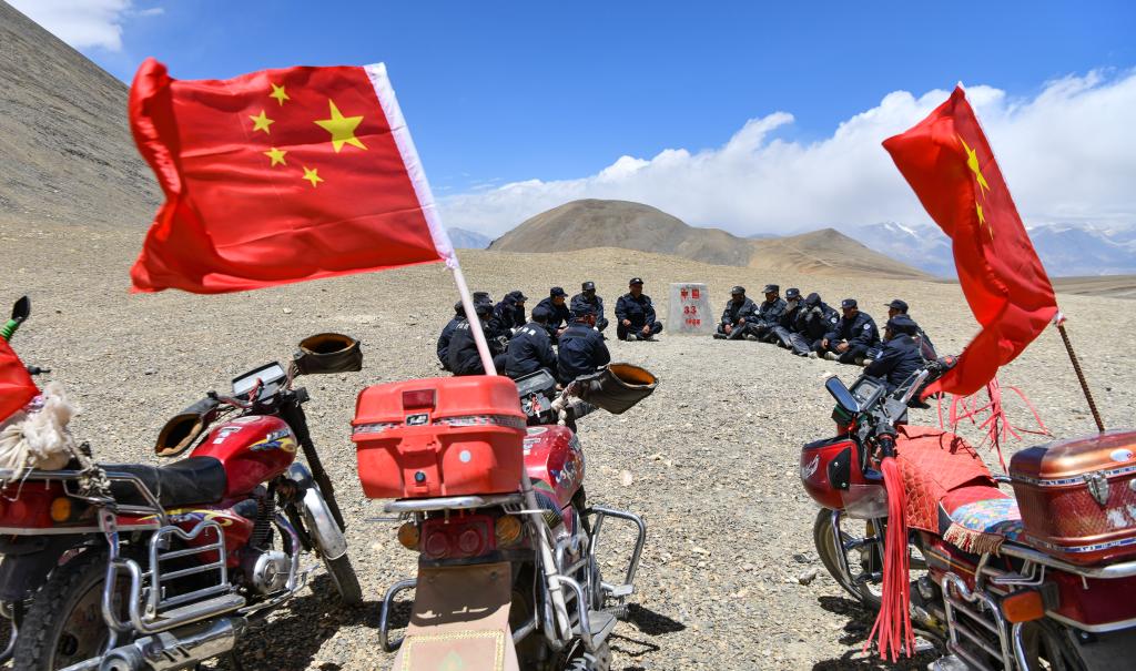 在33號界碑處,護(hù)邊隊在隊長石角(右二)的帶領(lǐng)下開展學(xué)習(xí)(6月2日攝)。新華社記者 晉美多吉 攝