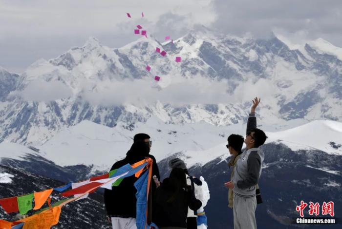游客在西藏林芝色季拉山觀景臺拋灑“隆達(dá)”(風(fēng)馬旗,藏族民眾的一種祈福方式)。李林 攝