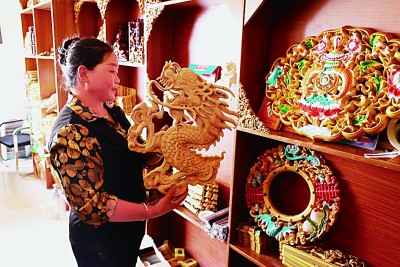 藏式木雕作為一種民間藝術(shù)形式,在西藏各地廣泛流行。圖為芒康縣一家工藝品店內(nèi),店主在擺放藏式木雕手工藝品。光明日?qǐng)?bào)記者 劉宇航攝