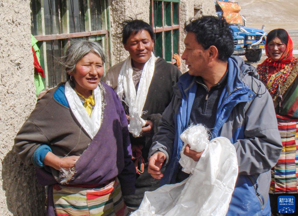 在西藏那曲市申扎縣曲松普村駐村期間,邊巴(前右)到群眾家中慰問(wèn)(資料照片)。新華社發(fā)(受訪者供圖)