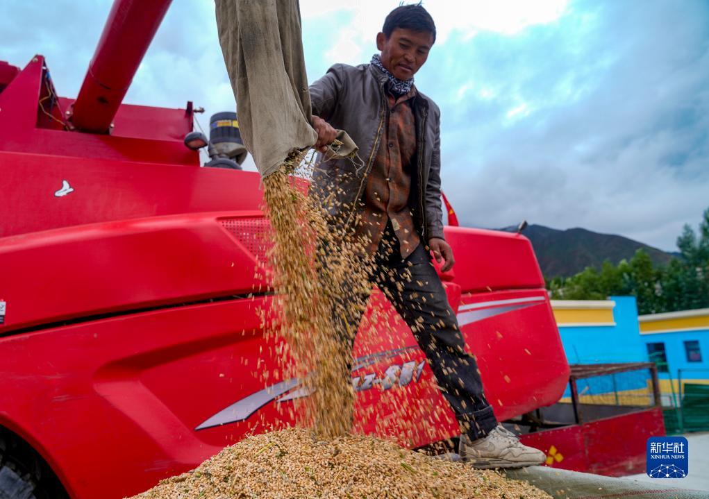 8月24日,乃東區(qū)的農(nóng)民在用聯(lián)合收割機(jī)收獲青稞。