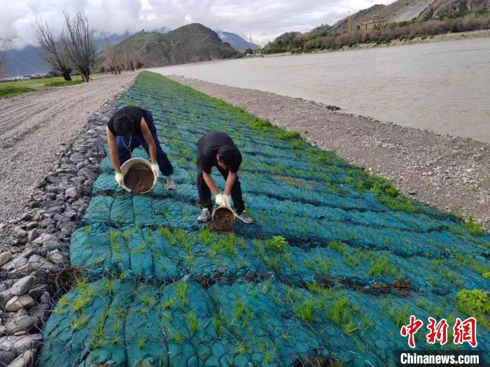 圖為工人們對生態(tài)袋進(jìn)行養(yǎng)護(hù)。中國水電基礎(chǔ)局西藏分公司供圖