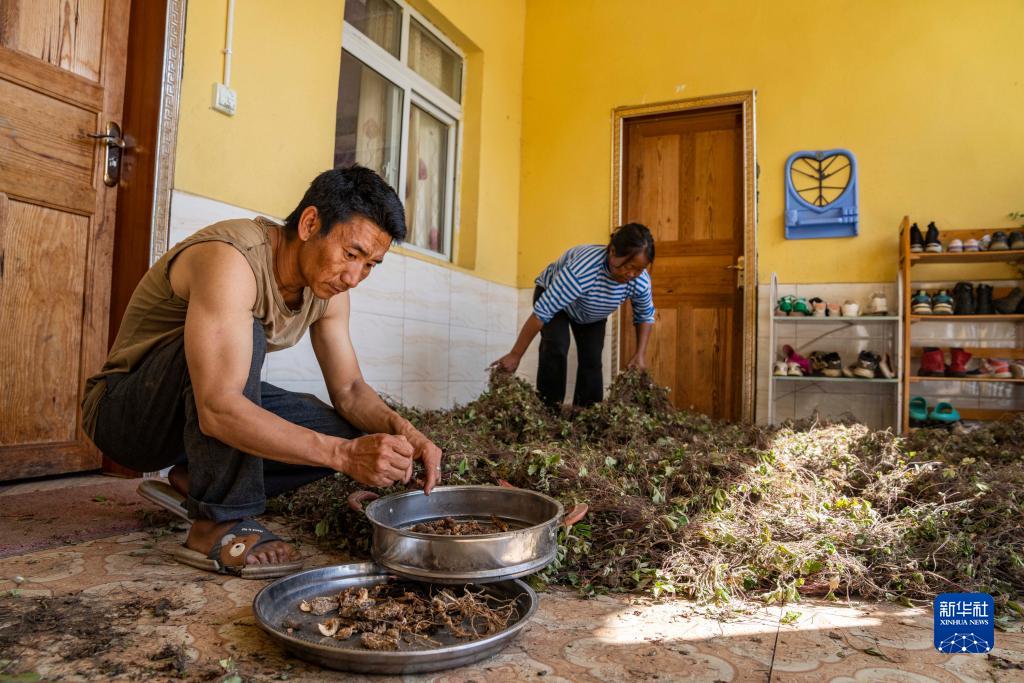 在西藏林芝市察隅縣,“采山人”在家中晾曬自己采集的林下作物(9月3日攝)。新華社發(fā)(丁增尼達 攝)