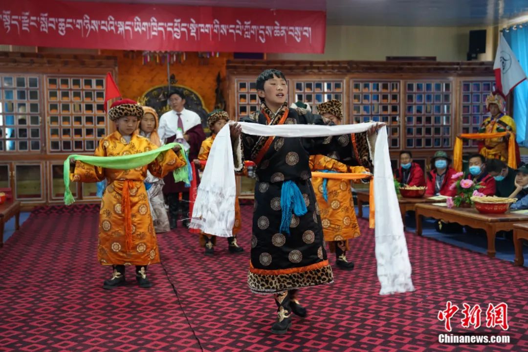 青海省雜多縣第二民族完全小學(xué)的學(xué)生表演格薩爾史詩說唱藝術(shù)。蘇丹 攝