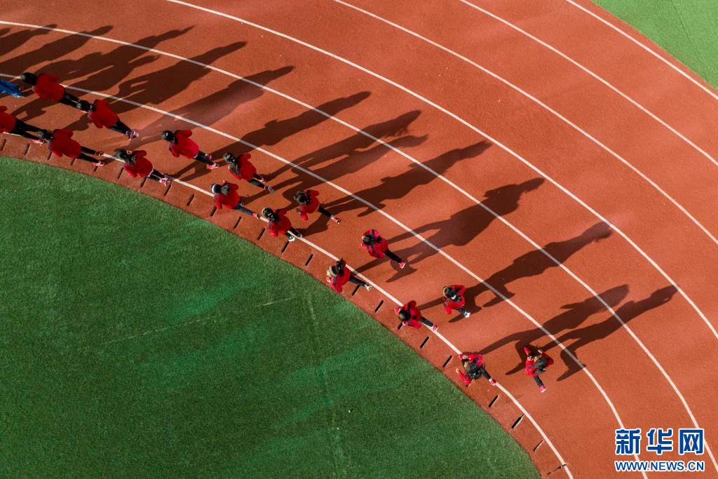 圖為那曲市第三小學(xué)學(xué)生在做體能訓(xùn)練(9月5日攝,無(wú)人機(jī)照片)。新華網(wǎng) 旦增努布 攝