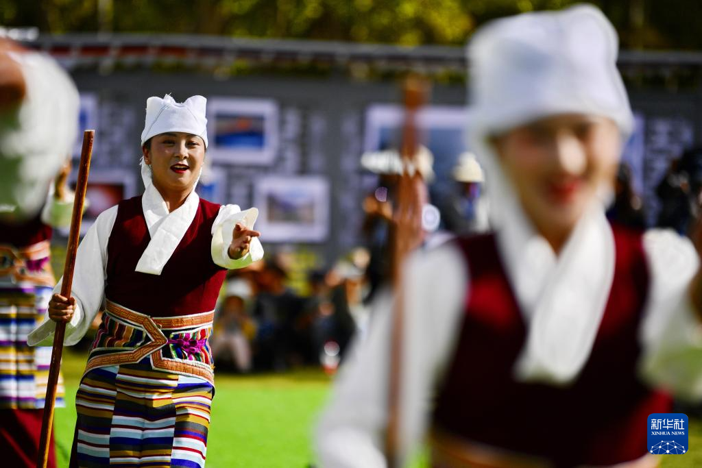 在拉薩市林周縣邊交林鄉(xiāng)當杰村,演員在第十六屆西藏珠穆朗瑪攝影大展開幕式上表演節(jié)目(9月8日攝)。新華社記者 張汝鋒 攝