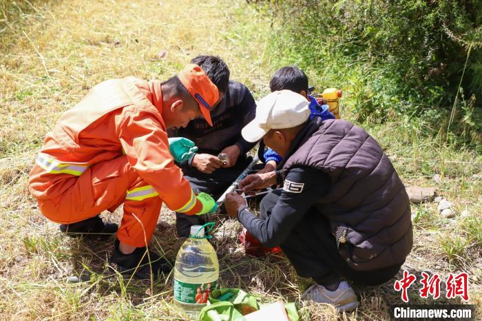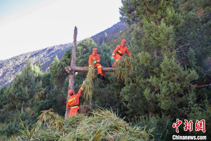 消防員將農(nóng)牧民的青稞掛到架子上晾曬,這是當(dāng)?shù)氐膫鹘y(tǒng)青稞晾曬方式。劉星文 攝