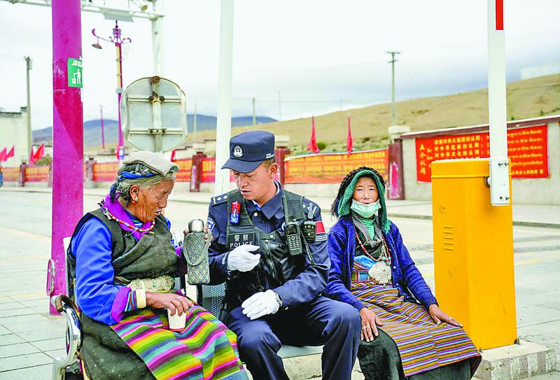 圖為曲崗邊境檢查站民警在巡邏途中與路邊休息的老人交談。記者 趙文慧 通訊員 巴桑頓珠 白瑪倉(cāng)覺(jué) 攝