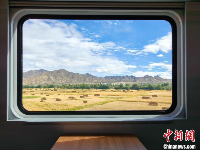 9月23日,從西藏日喀則開往拉薩的C886次列車上望向窗外,是一片豐收堆垛的青稞地。中新社記者 江飛波 攝