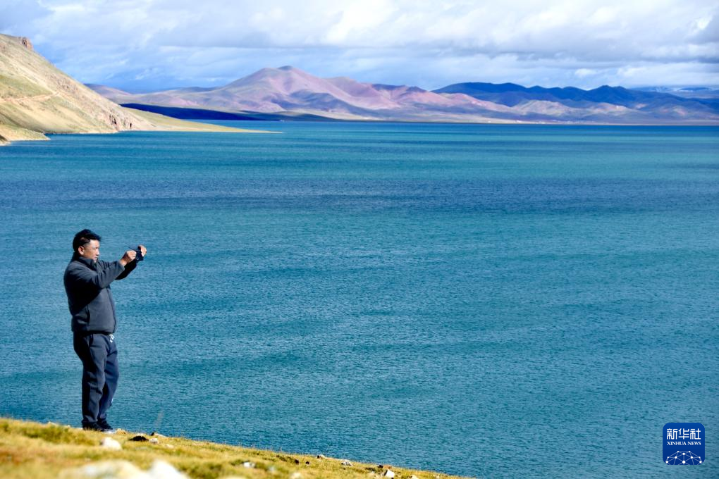 一名游客在錯那湖畔拍照留念(9月22日攝)。新華社記者 劉文博 攝