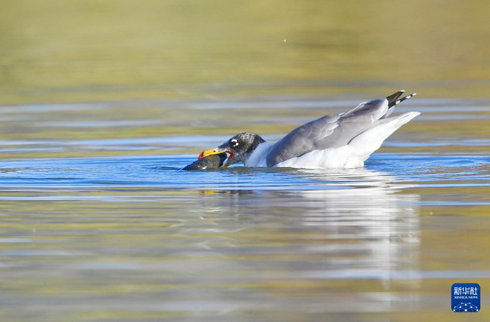 在西藏拉薩拉魯濕地,一只漁鷗在水里捉到魚(10月3日攝)。新華社記者 張汝鋒 攝