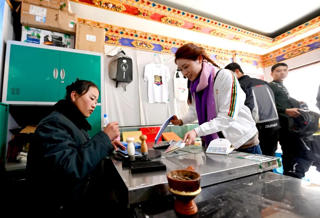 記者到來時,看到一些氣喘吁吁、高反嚴重的游客顧不上休息調整,一下車就進了郵局?!澳茉诤0?000多米的地方給家人朋友寄一張明信片,意義絕對不一般!”一位游客笑著說。