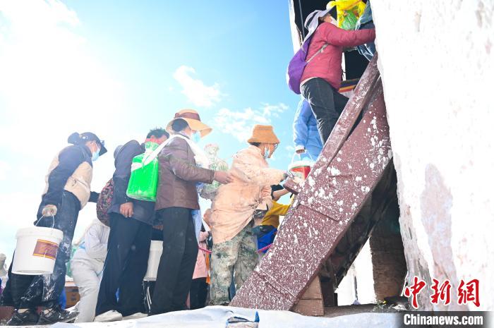 10月18日,背著涂料排隊(duì)準(zhǔn)備粉刷布達(dá)拉宮的民眾。中新社記者 趙朗 攝