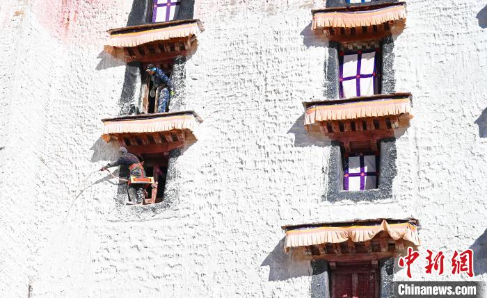 西藏布達(dá)拉宮18日迎來(lái)新一季粉刷,按照慣例,每季粉刷將在藏歷9月22日“神降節(jié)”前完成。