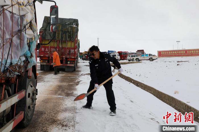 “現(xiàn)在唐古拉山路段處于不間斷堵車狀態(tài),昨天我們這一隊(duì)是從下午開(kāi)始除雪保通,持續(xù)到今天凌晨4點(diǎn)左右才全部疏通?!?1日下午,中新網(wǎng)記者連線西藏安多縣公安局交通管理中心秩序中隊(duì)隊(duì)長(zhǎng)達(dá)娃云旦,他介紹,10月17日以來(lái),國(guó)道109線唐古拉山段持續(xù)降雪,積雪結(jié)冰,道路通行受阻。安多警方“以雪為令”全力救援被困乘客、車輛,進(jìn)行除雪保通。